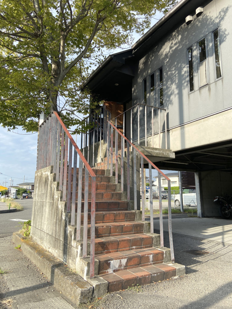 黒い外観が印象的な2階建ての建物で、1階が駐車場、外階段を上って店内へ入るスタイルです。